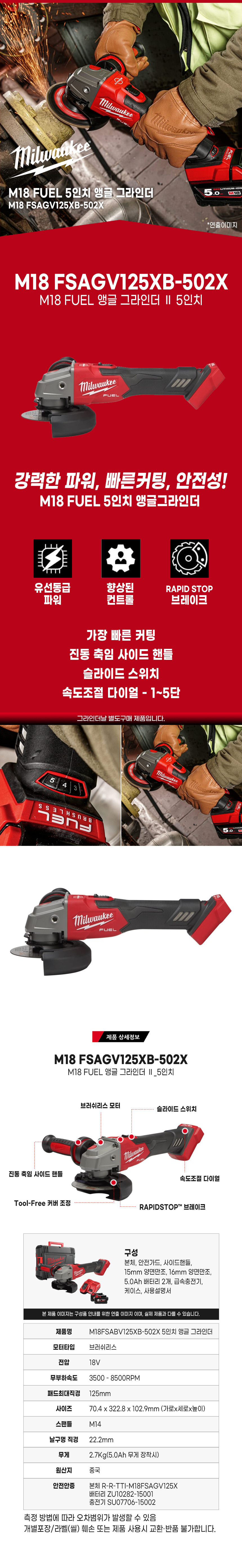 밀워키 M18 FUEL 앵글 그라인더 5인치 세트 M18 FSAGV125XB-502X