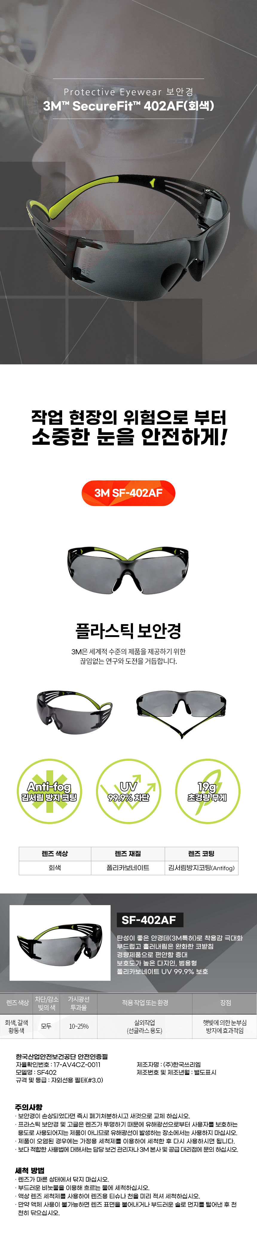 3M SF402AF 보안경 보호안경 회색 김서림 방지 산업 안전