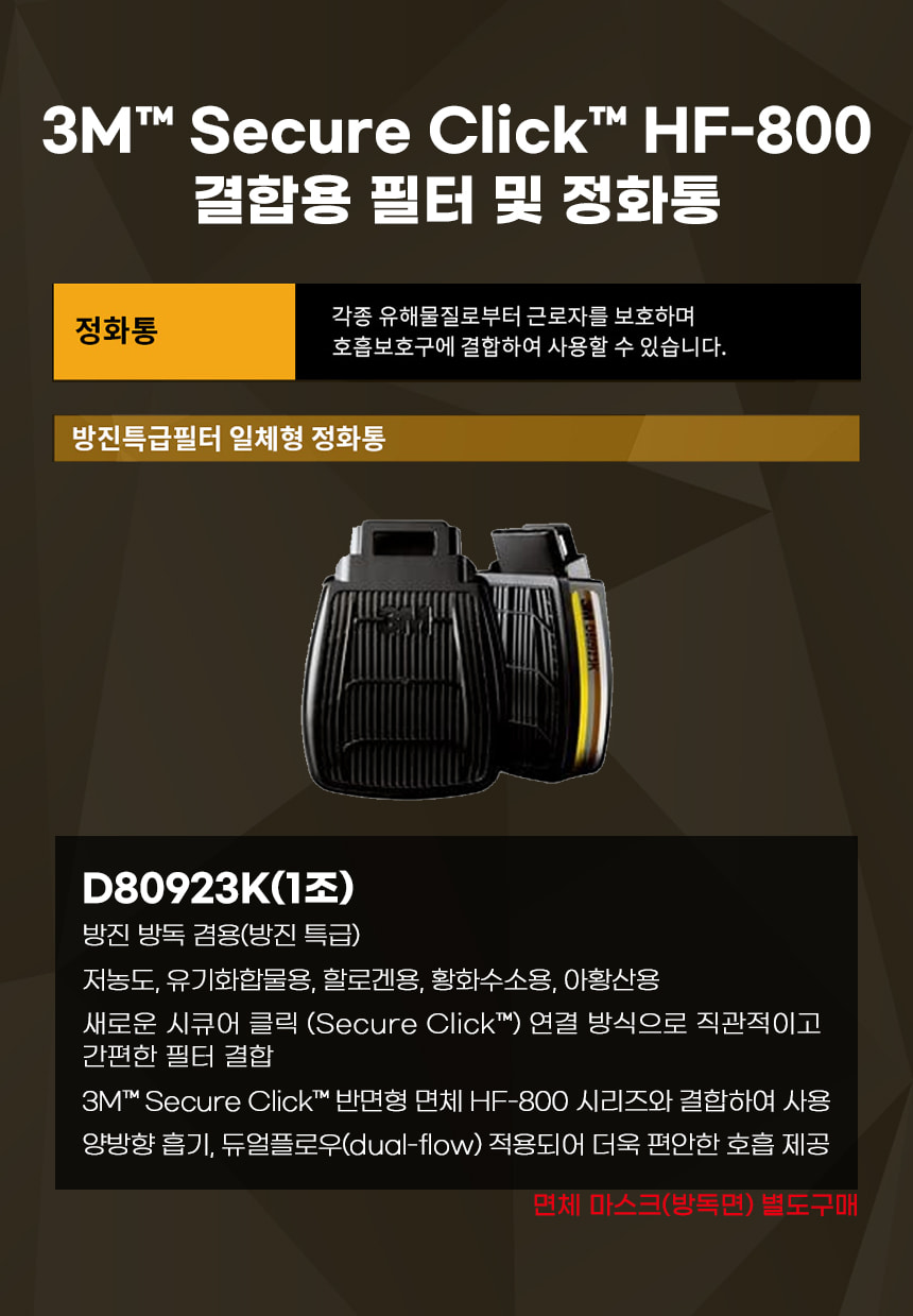 3M 일체형 방독 정화통 D80923K 1조 산업 안전 방독 면체 마스크 HF-800 저농도 유기화합물 할로겐 황화수소 아황산