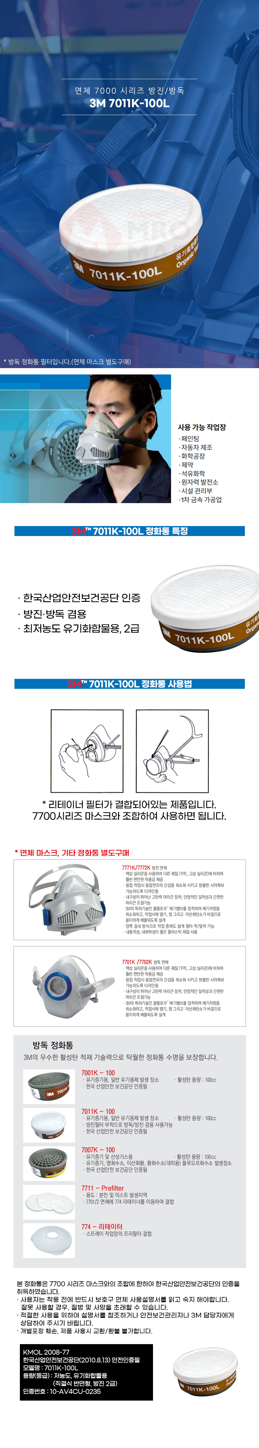 3M 7011K-100L 정화통 필터 방독 면체 마스크 단구형 교체 유기용제