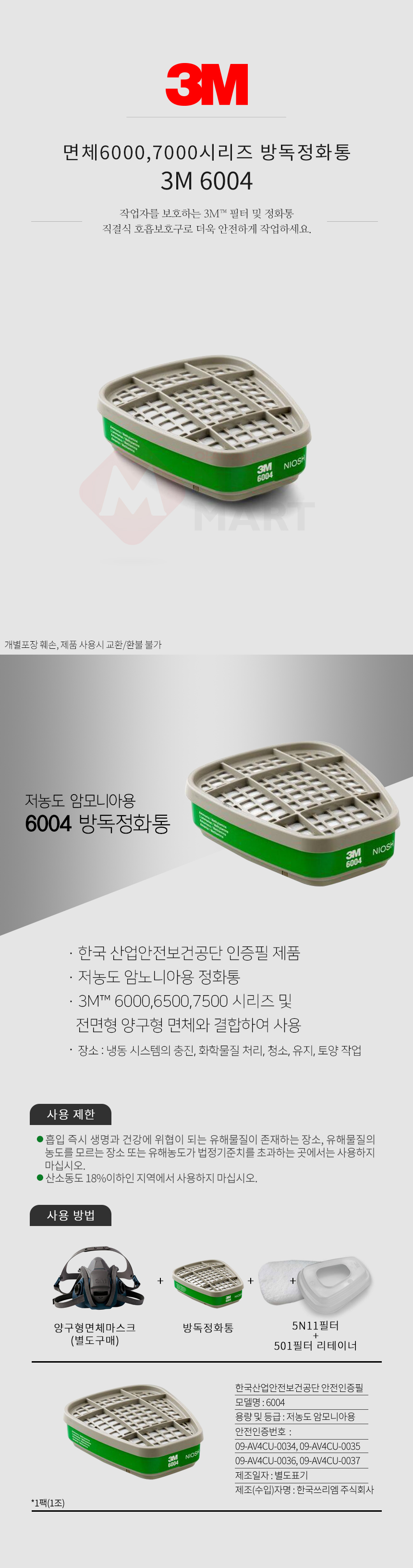 3M 6004 정화통 필터 방독 면체 마스크 양구형 교체 암모니아