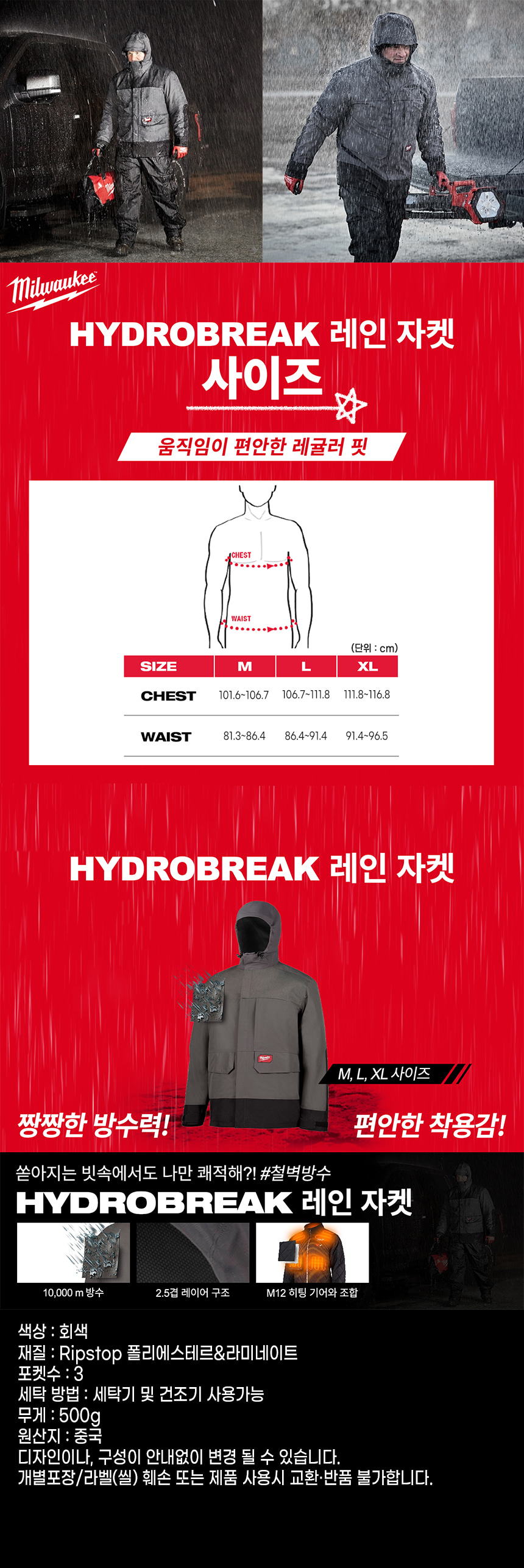 밀워키 HYDROBREAK 레인 자켓 방수 후드 우의 우천 작업복