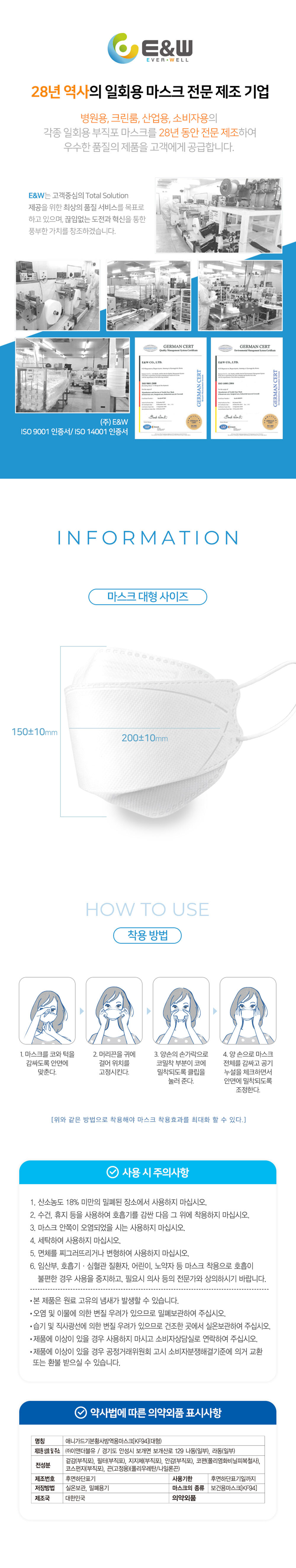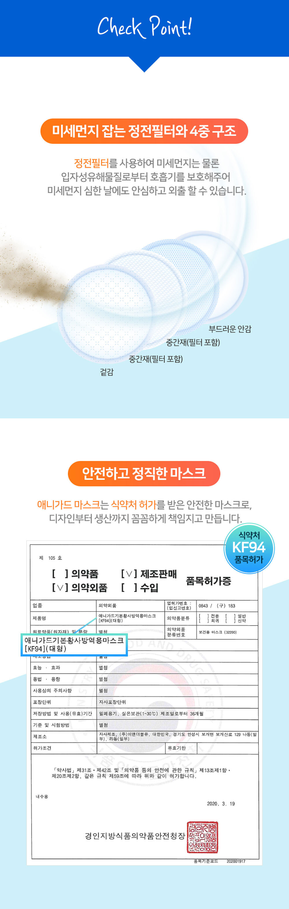 애니가드 황사 방역 마스크 KF94 대형 흰색 3매입 성인 국산