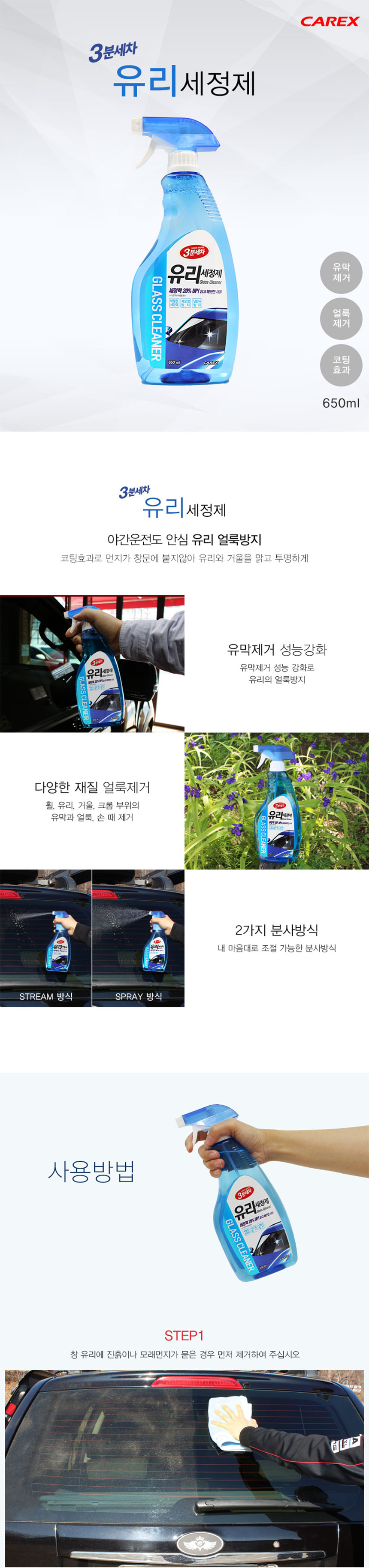 카렉스 3분세차 유리 세정제 650ml 유막 얼룩 제거 코팅 세차