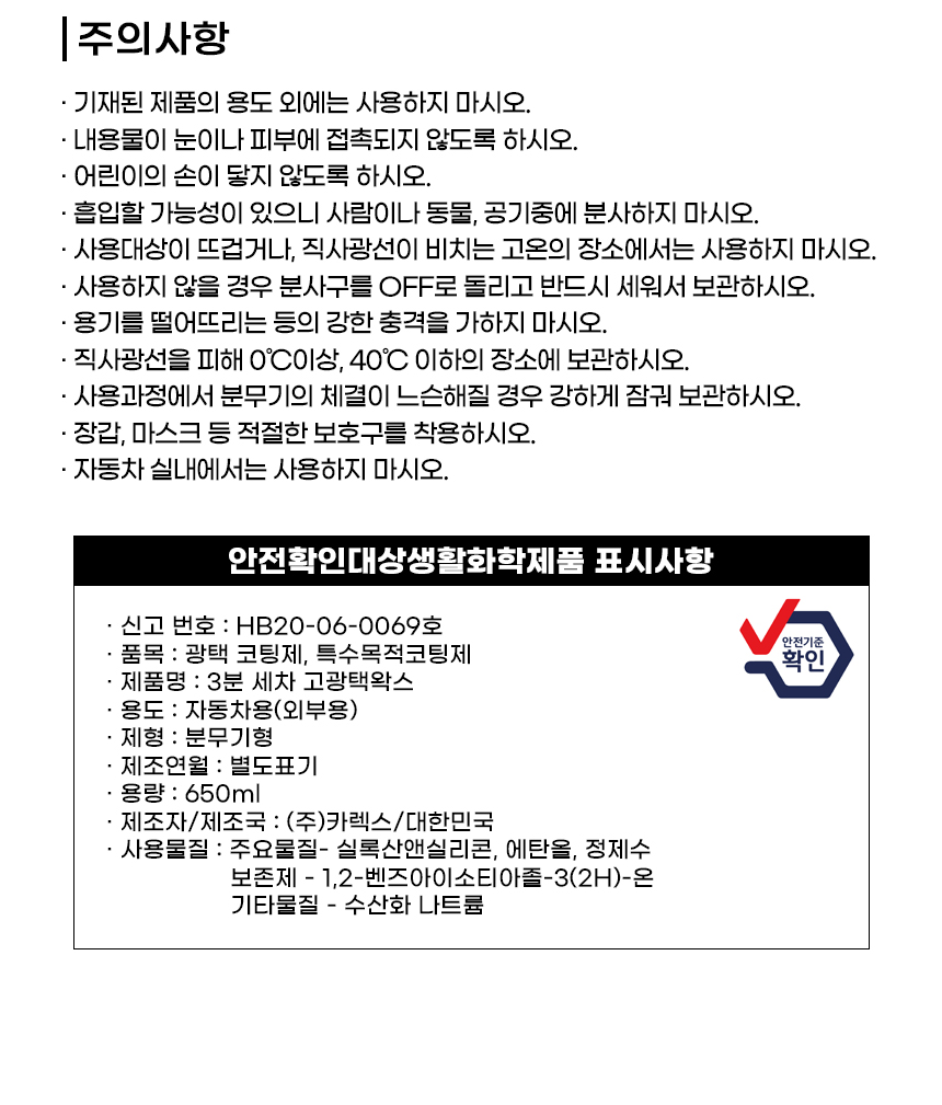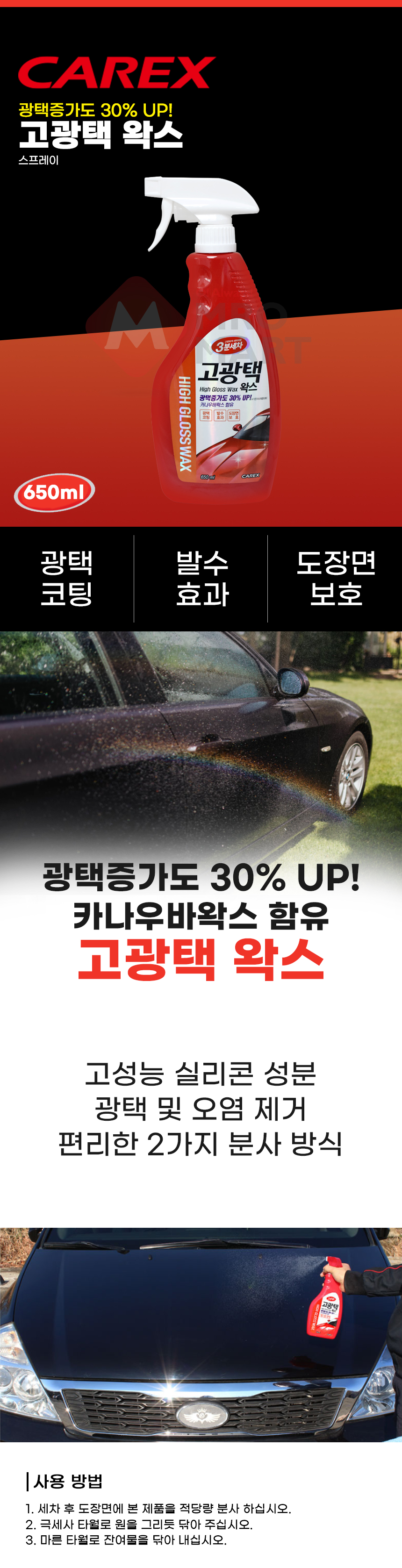 카렉스 고광택 왁스 스프레이 650ml 세차 광택 카나우바 발수 보호