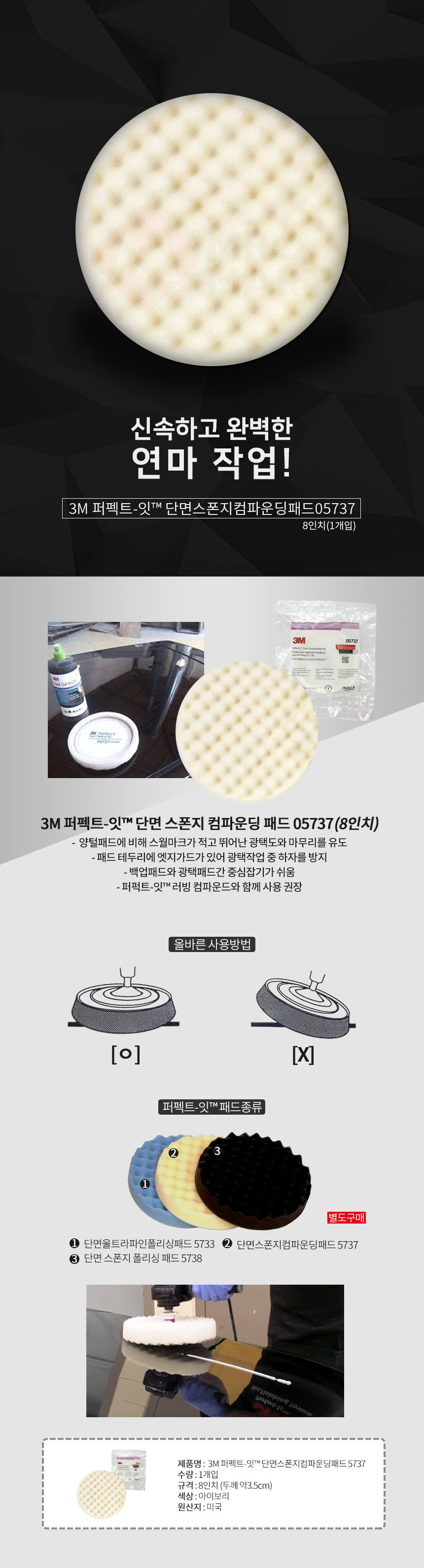3M 퍼펙트잇 8인치 단면 스폰지 컴파운딩 패드 05737 탈부착 세차 차량 광택
