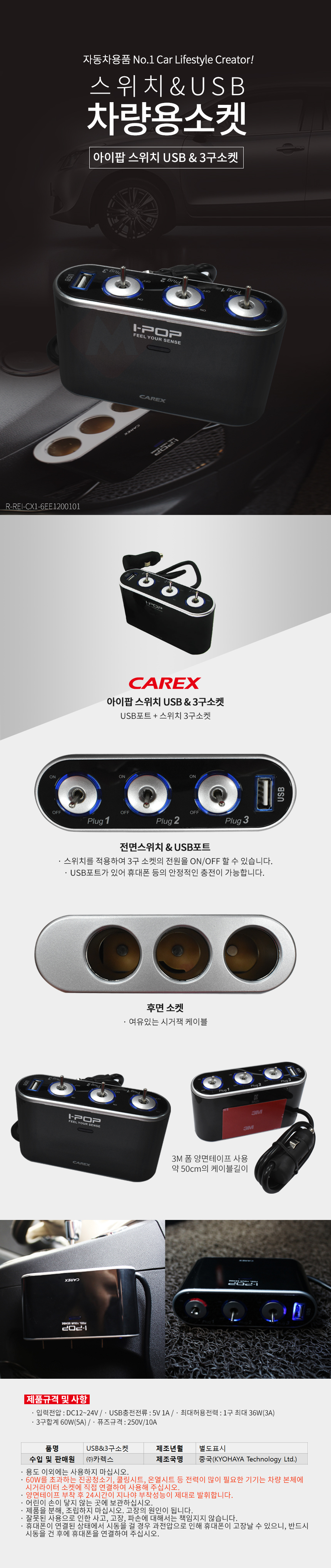 아이팝 스위치 USB&3구소켓 시거잭 충전기 자동차 차량 용품