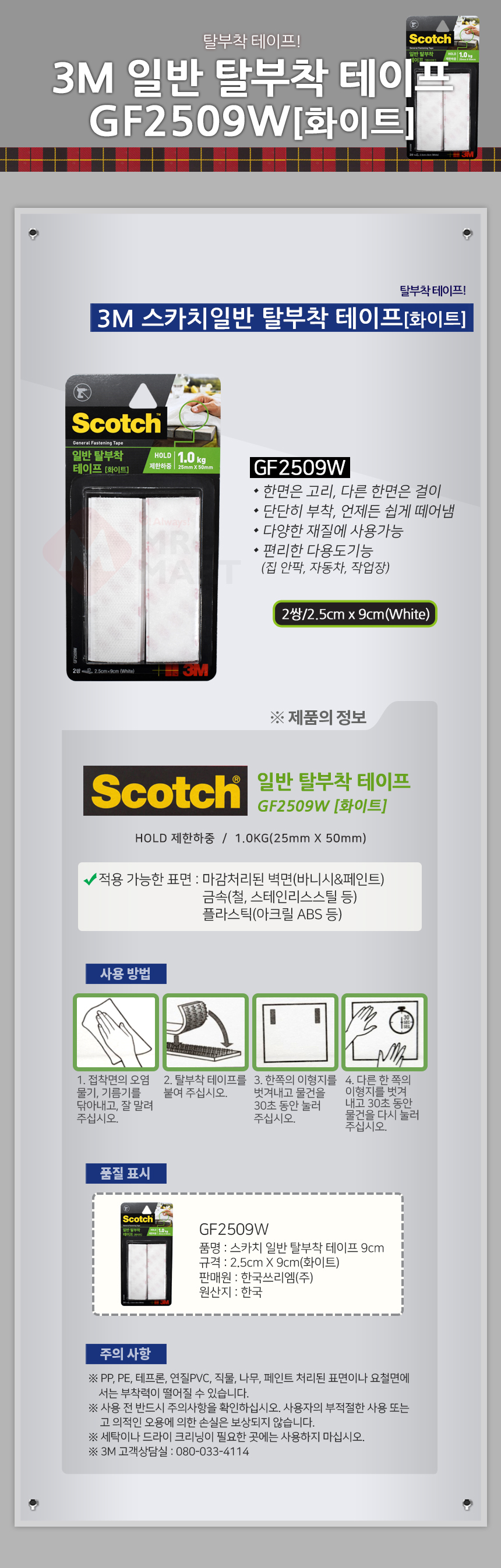 3M 스카치 일반 탈부착 테이프 GF2509W 화이트 2.5cmX9cm 양면 강력 찍찍이