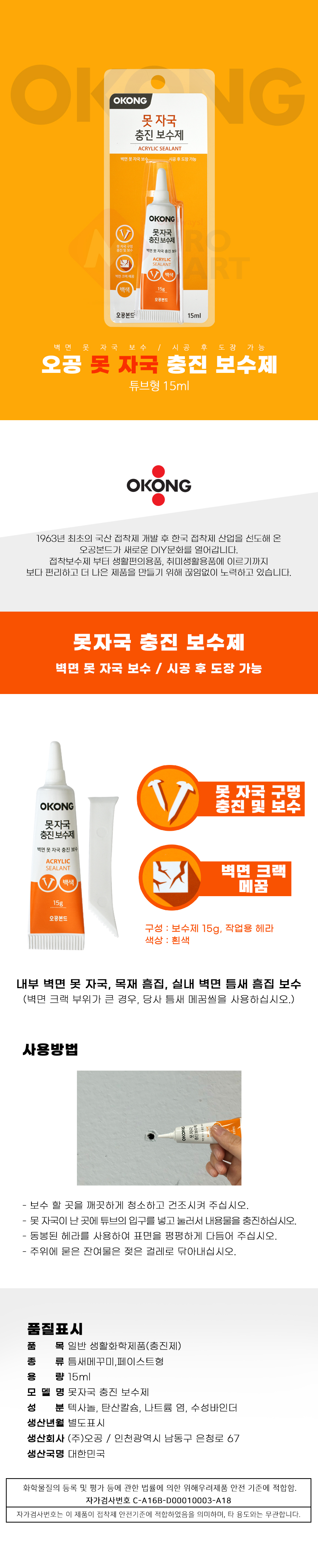 오공 못자국충진보수제 15ml 못 자국 구멍 벽면 크랙 메꿈 보수