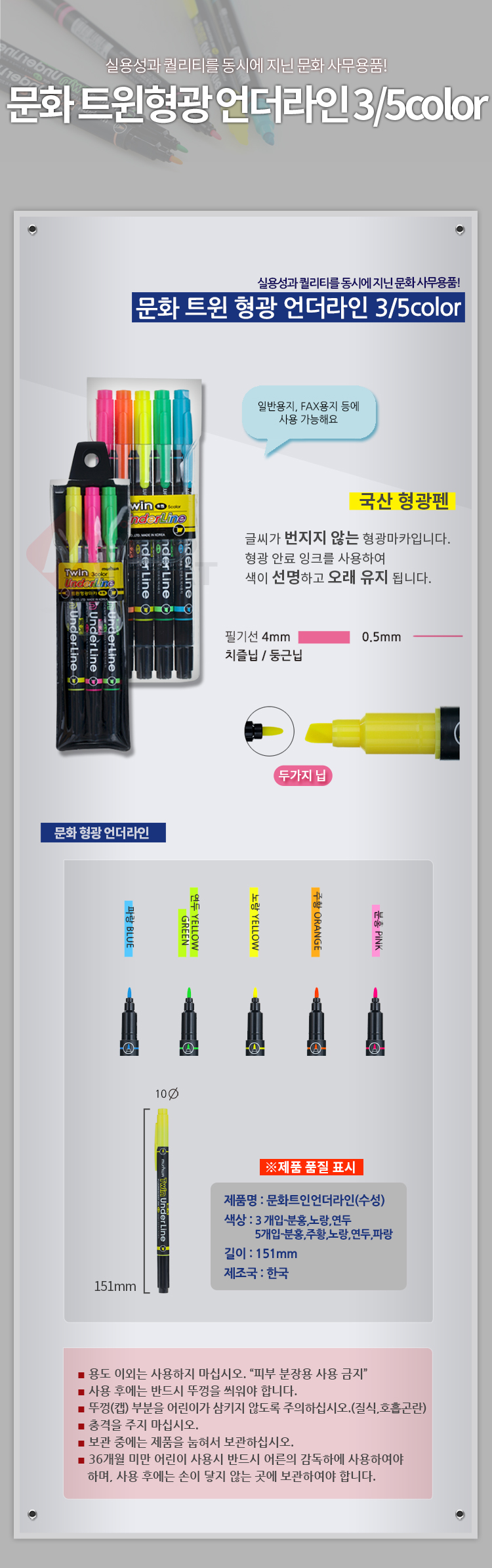 문화 트윈 형광 언더라인 5색 세트 형광펜 형광 마카 수성 필기구 사무용품 컬러펜 필기