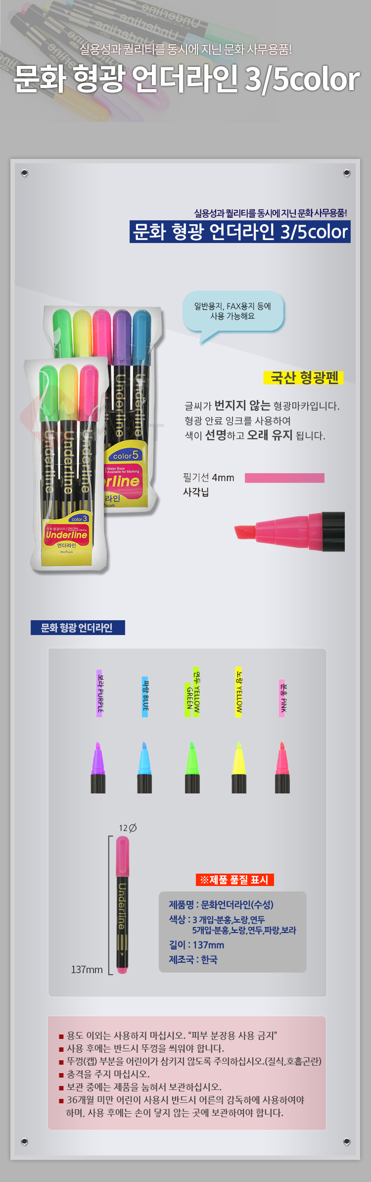 문화 형광 언더라인 3색 세트 형광펜 형광 마카 수성 필기구 사무용품 컬러펜 필기