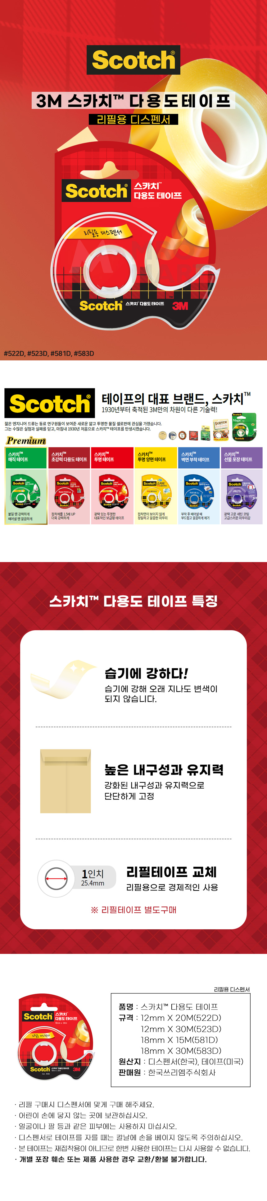 3M 스카치 다용도 테이프 디스펜서 12mmX20m 522D 1인치 코어 사무 문구