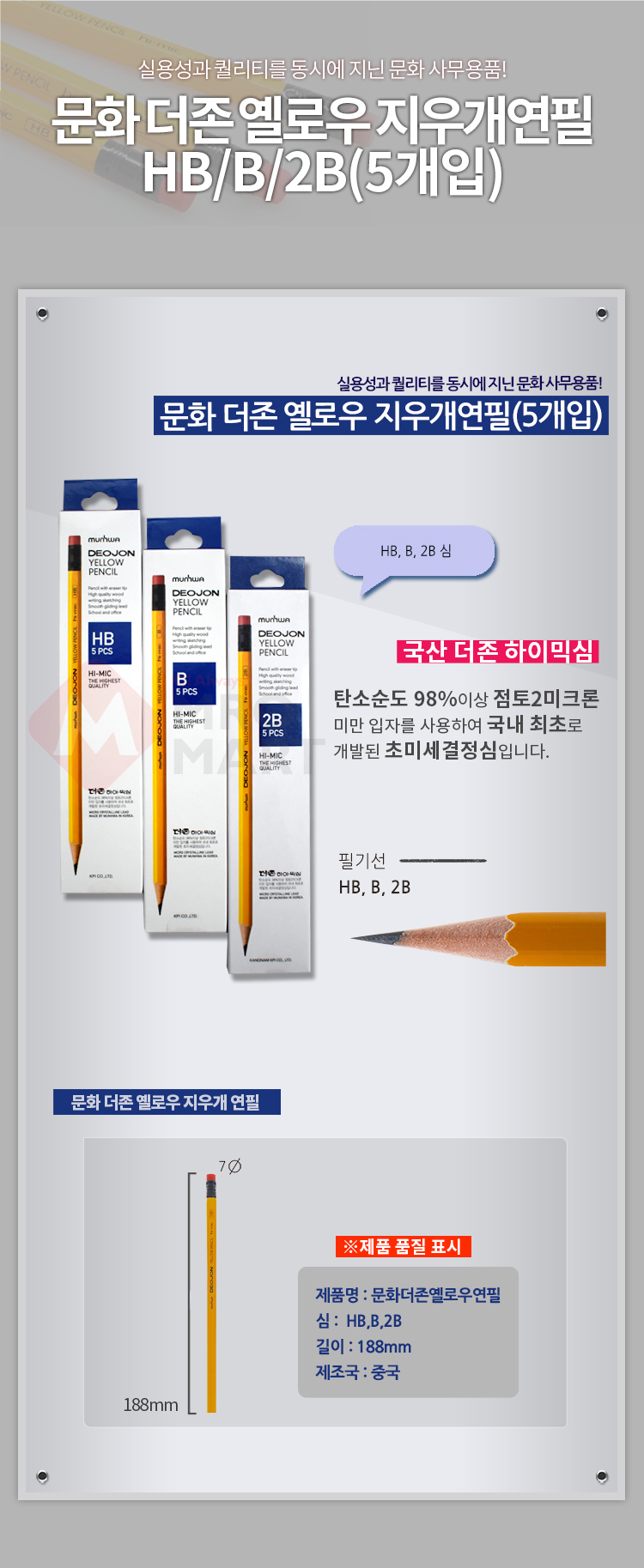 문화 더존 옐로우 지우개 연필 HB B 2B 5개입 필기 도구 학용품