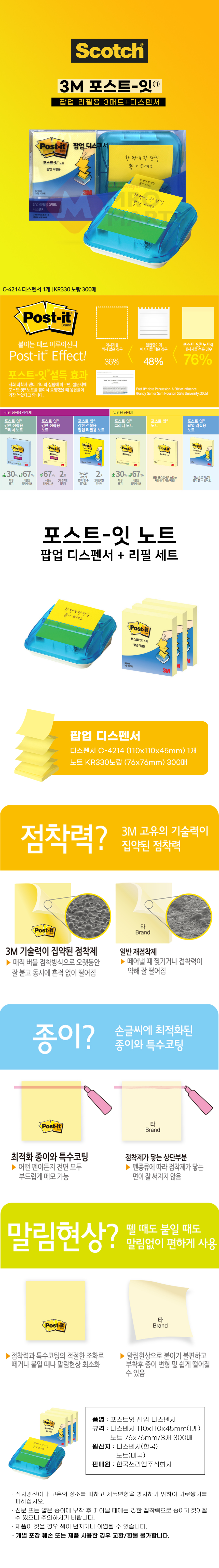 3M 포스트잇 노트 C-4214 팝업 디스펜서 리필 세트 접착 점착 메모지