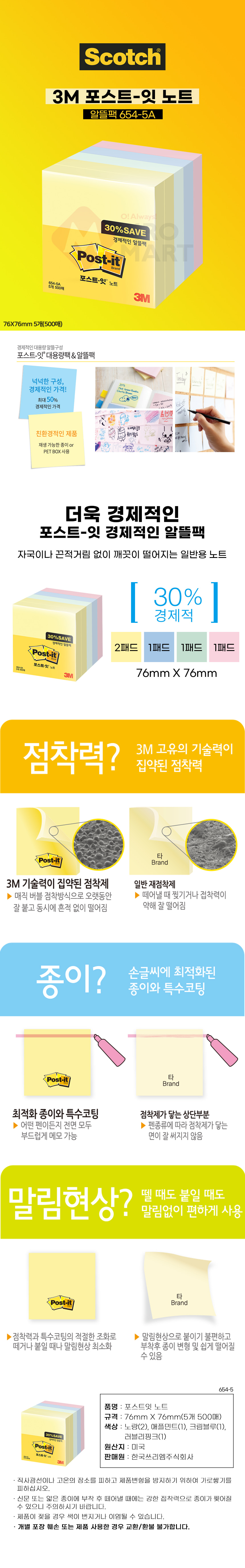 3M 포스트잇 노트 654-5A 알뜰팩 접착 점착 메모지