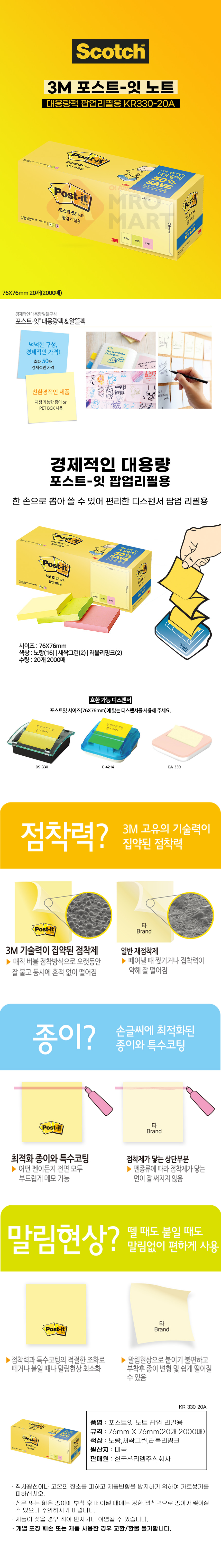 3M 포스트잇 노트 KR330-20 팝업리필용 대용량팩 접착 점착 메모지