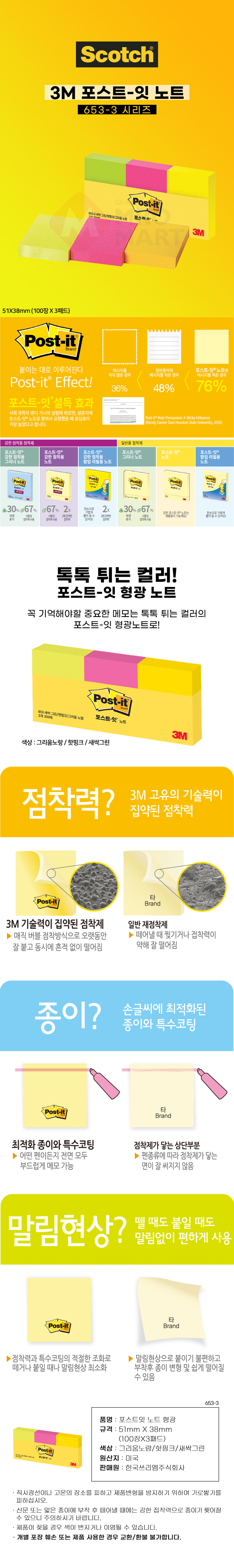 3M 포스트잇 형광 노트 653-3 패드 접착 점착 메모지