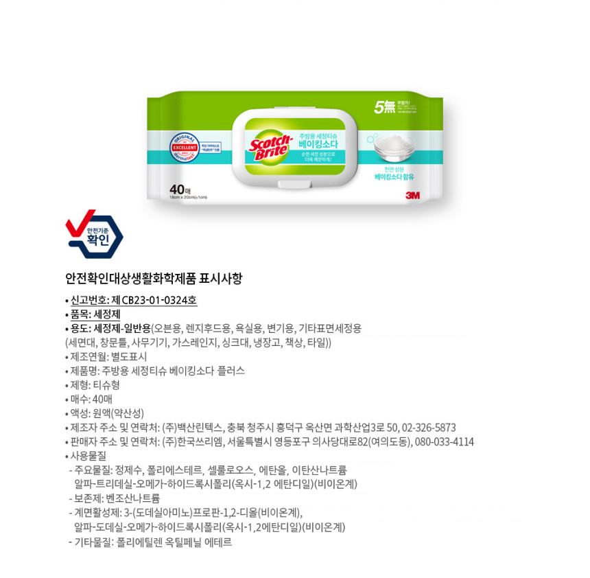 3M 스카치브라이트 주방용 세정 티슈 베이킹 소다 플러스 40매 기름때 제거 부엌 청소 일회용