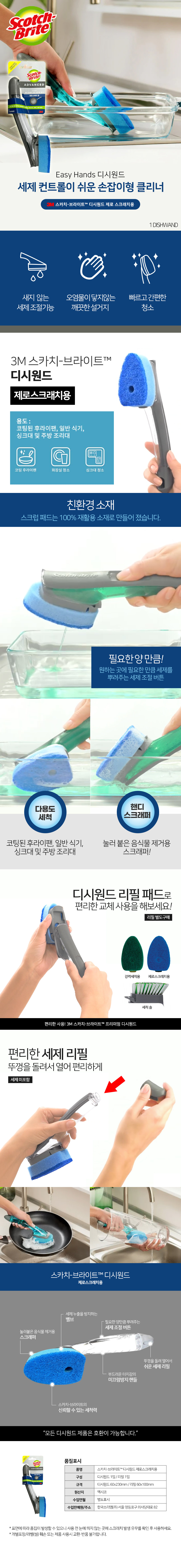 3M 스카치브라이트 디시원드 손잡이 수세미 제로 스크래치 1입 451U-4 자동 세제 주방 청소 설거지