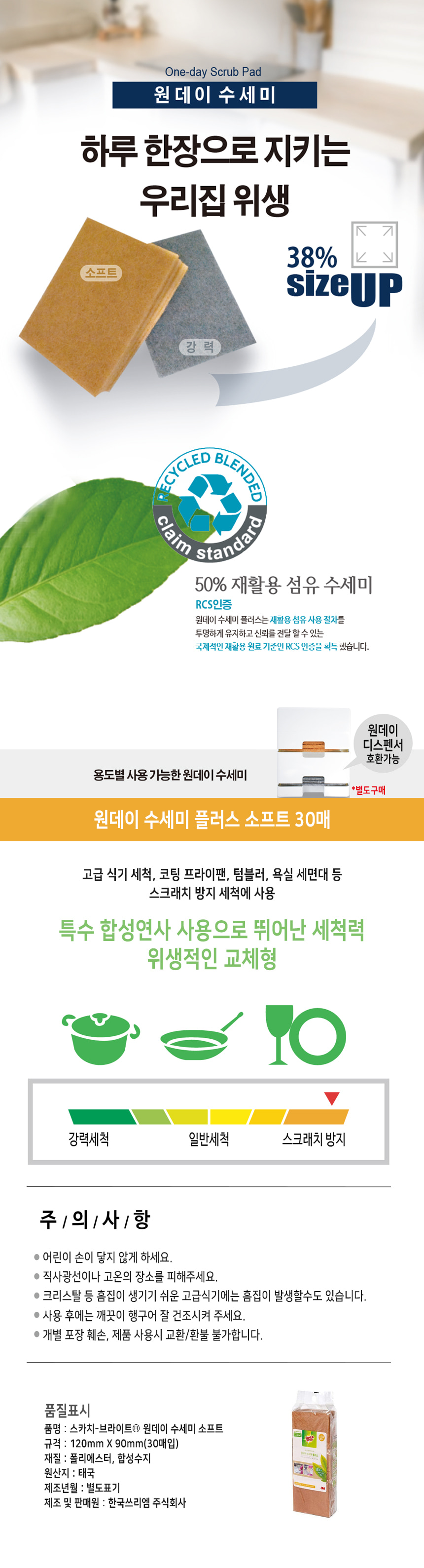 3M 스카치브라이트 원데이 수세미 플러스 소프트 30매 120mmX90mm 주방 설거지 청소