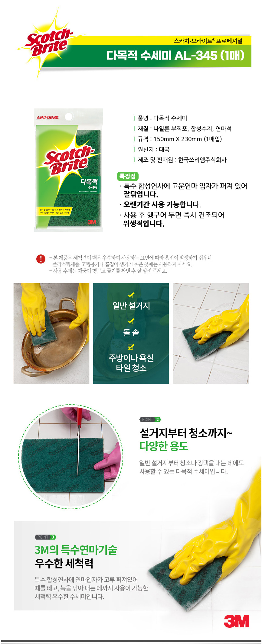 3M 스카치브라이트 다목적 수세미 AL-345 1매 주방 설거지 청소