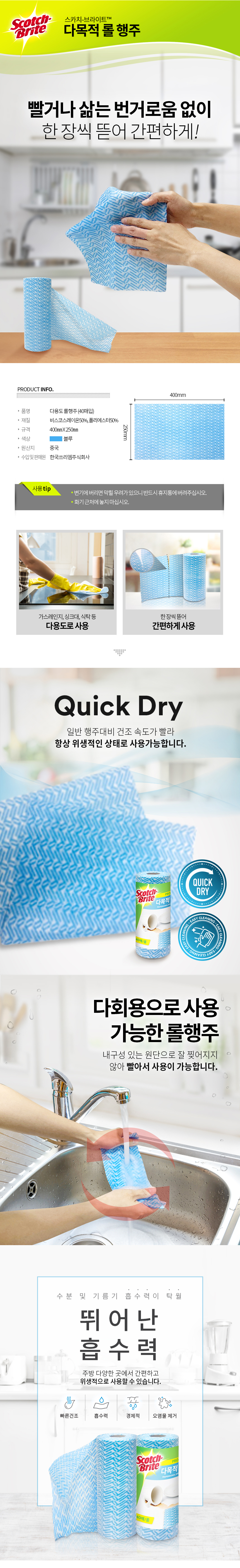 3M 다목적 롤 행주 40매입 1롤 40cmX25cm 주방 청소 다회용 빨아쓰는