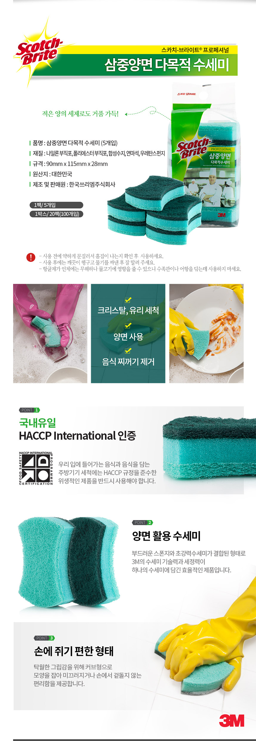3M 스카치브라이트 삼중 양면 다목적 수세미 5입 MD100DB 세척 주방 설거지 청소