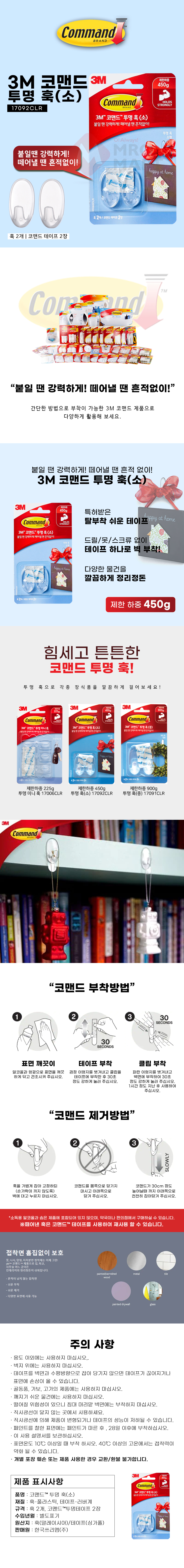 3M 코맨드 투명 훅 소 17092CLR 후크 벽 걸이 고리 정리 부착