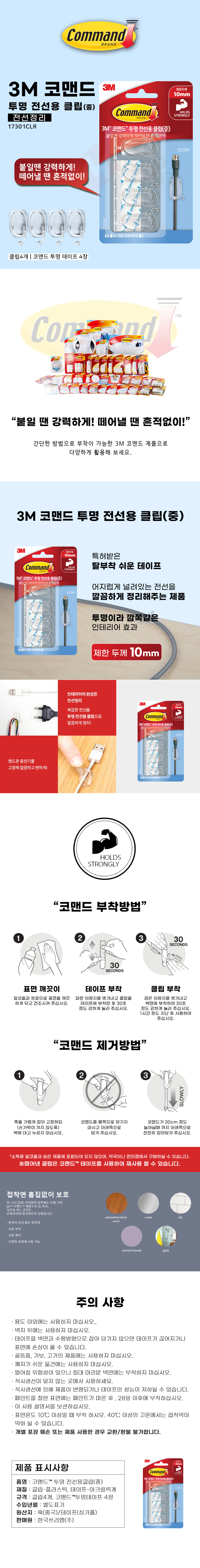 3M 코맨드 투명 전선용 클립 중 17301CLR 전선정리
