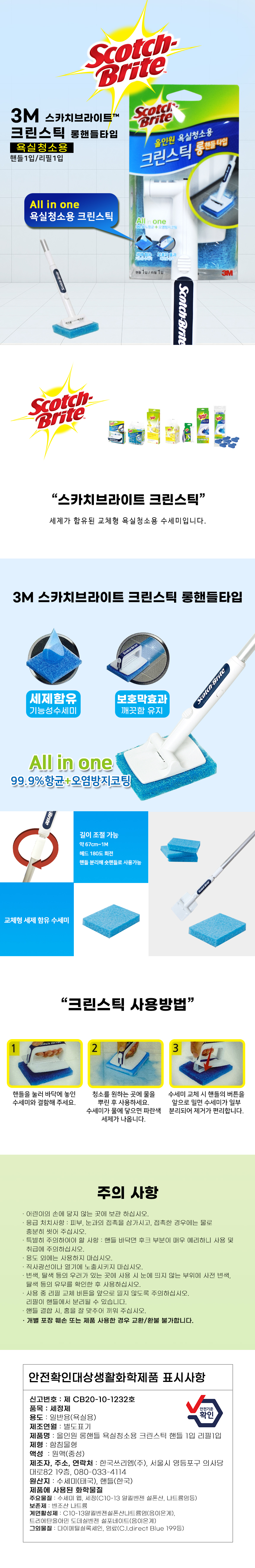 3M 스카치브라이트 올인원 욕실청소용 롱핸들 크린스틱 1H1R