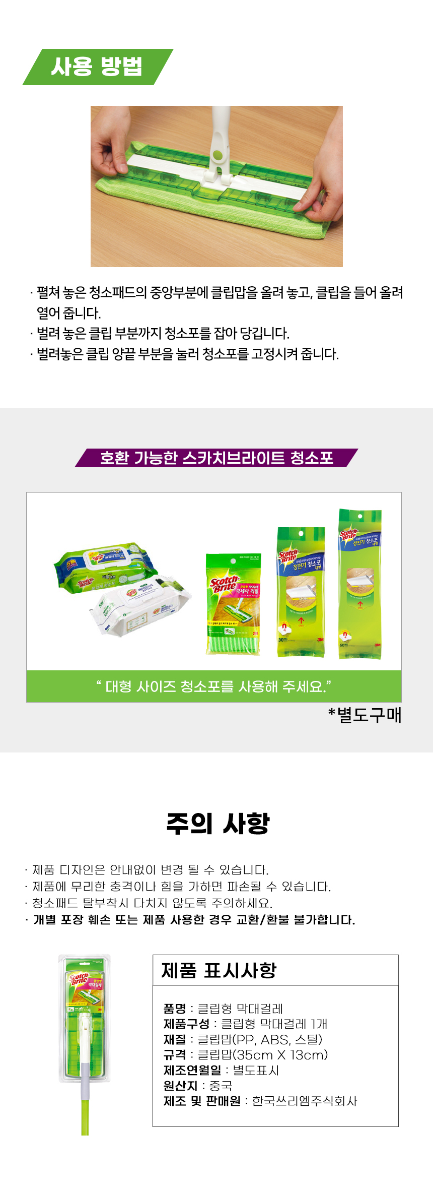 3M 스카치브라이트 클립형 막대걸레 청소 밀대 1개 35cmX13cm