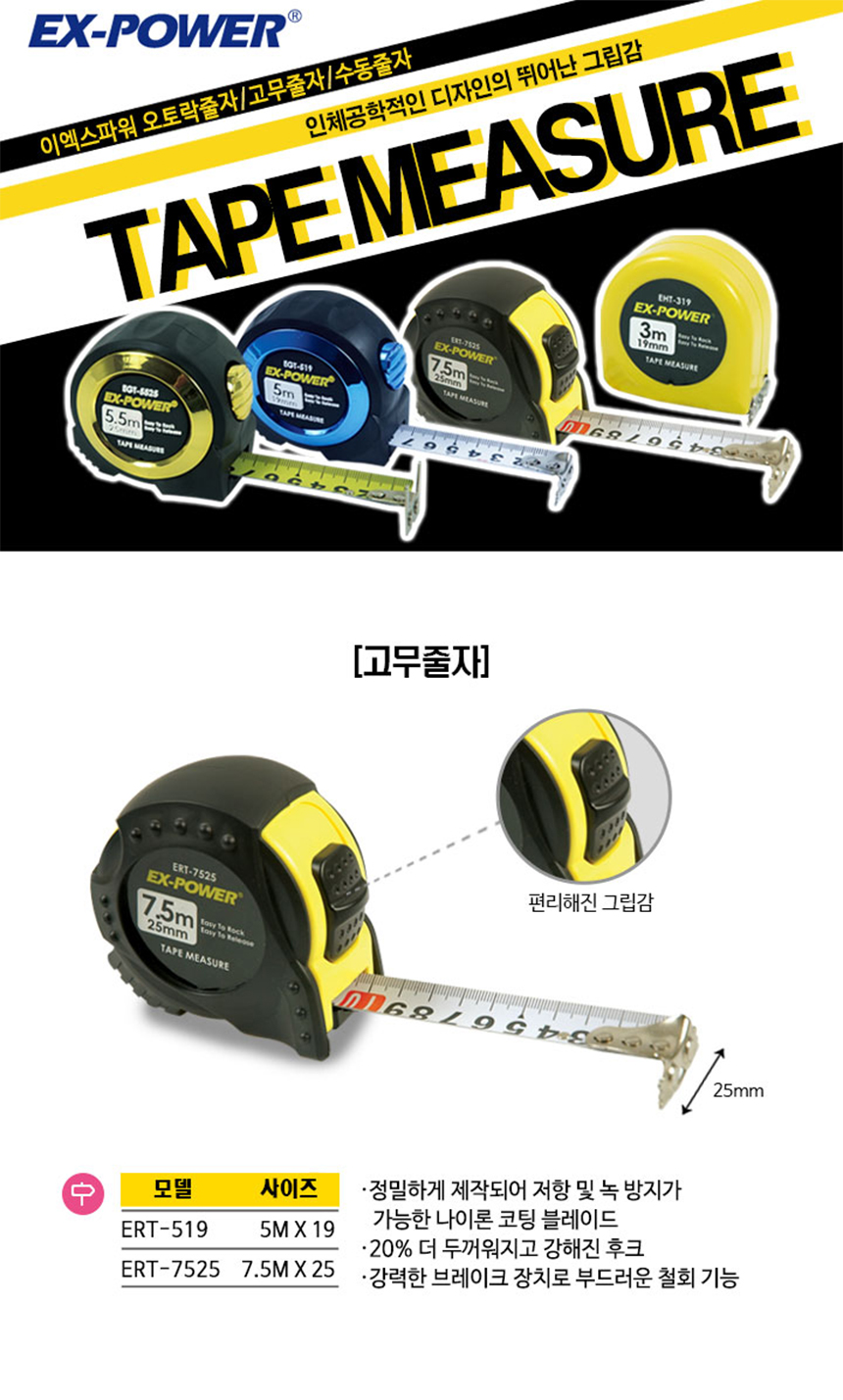 이엑스파워 고무 줄자 7.5M ERT-7525 측정 수공구