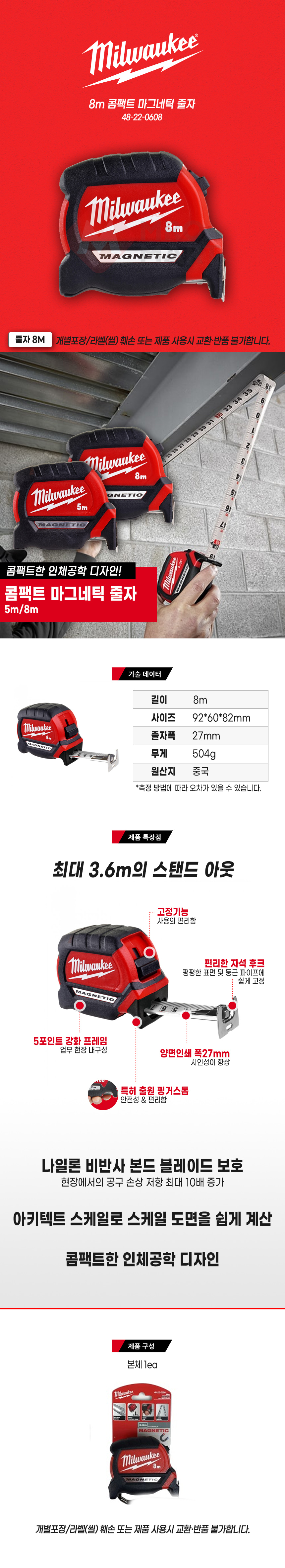 밀워키 48-22-0608 콤팩트 마그네틱 줄자 8m