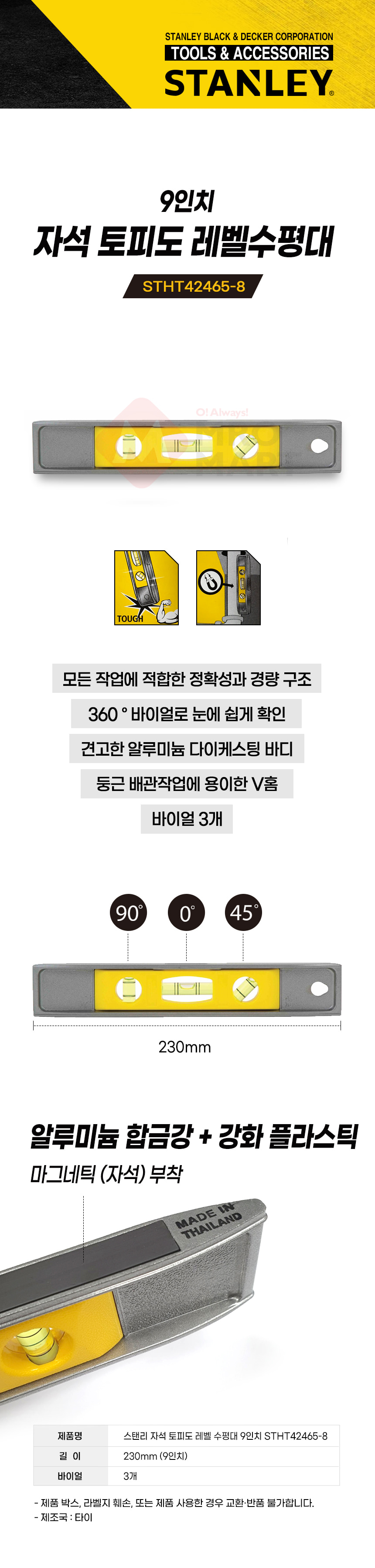 스탠리 STHT42465-8 자석 토피도 레벨 수평대 수평계 9인치 알루미늄