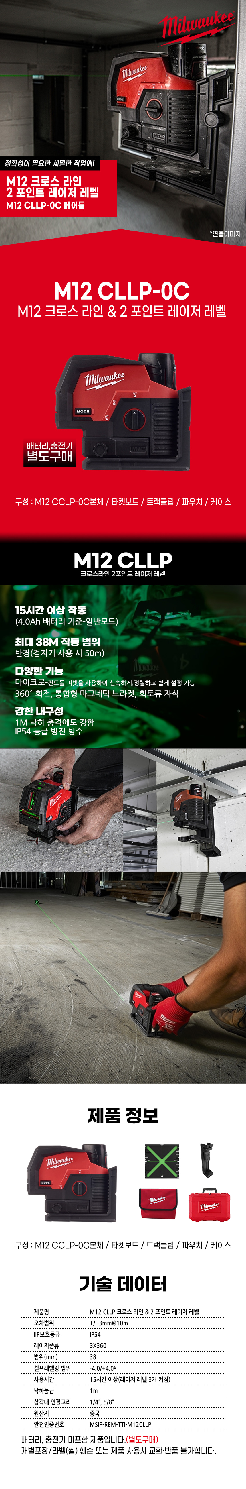 밀워키 12V 충전 크로스 라인 2포인트 레이저 레벨기 베어툴 M12 CLLP-0C 그린 레이저 측정 공구