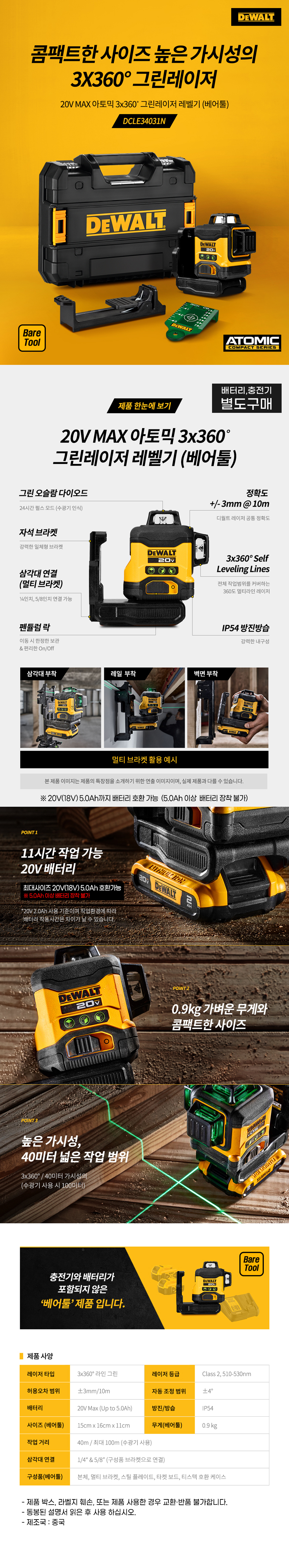 디월트 DCLE34031N 아토믹 3x360˚ 그린레이저 레벨기 베어툴 20V MAX