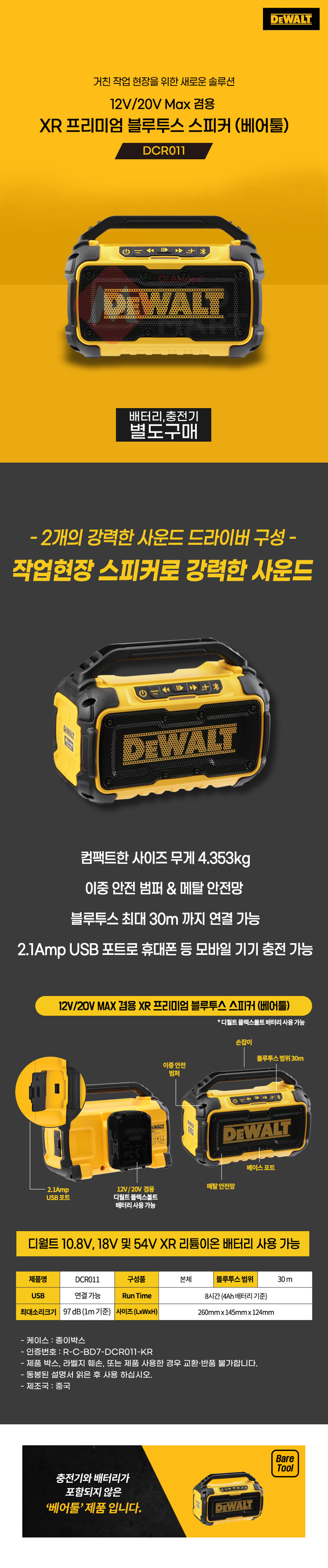 디월트 DCR011 충전 블루투스 스피커 베어툴 본체만 배터리 충전기 미포함 12V 20V 60V