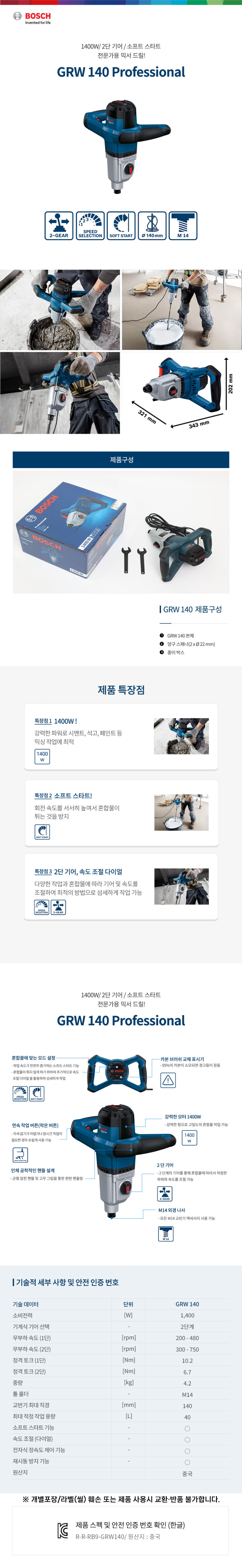 보쉬 GRW 140 전기 유선 믹서 드릴 06011C40B0 시멘트 콘크리트 믹싱 교반기 믹서기