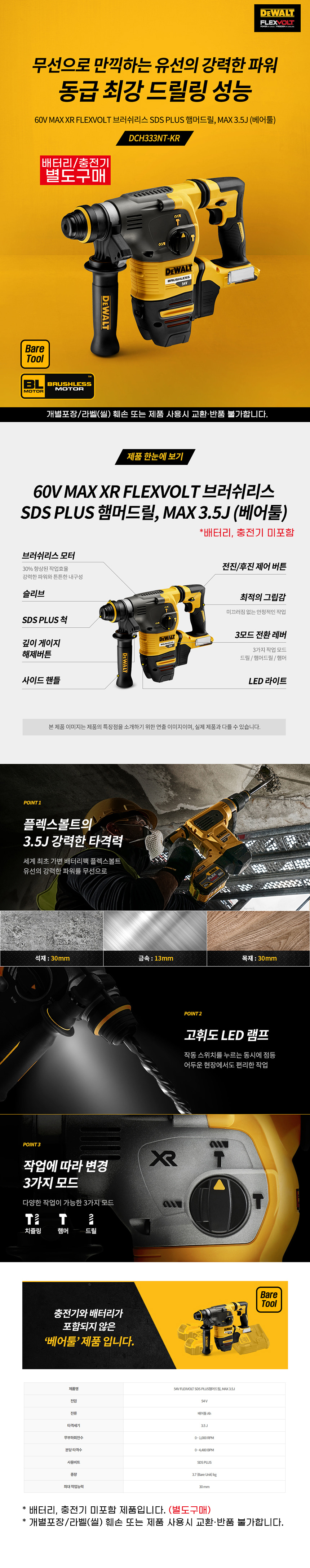 디월트 60V MAX 플렉스볼트 SDS PLUS충전 햄머 드릴 베어툴 DCH333NT 함마 해머 3.5J