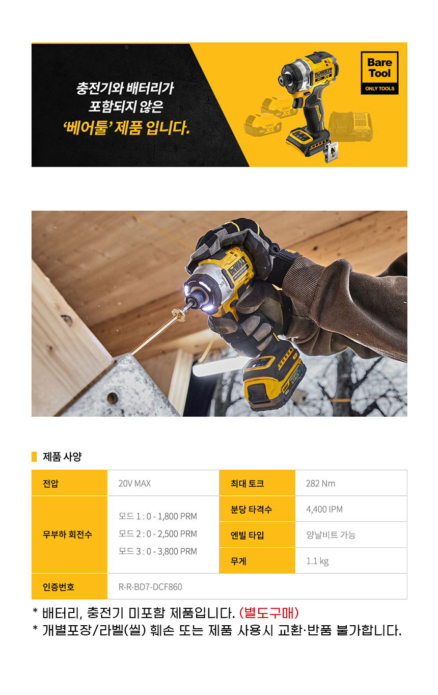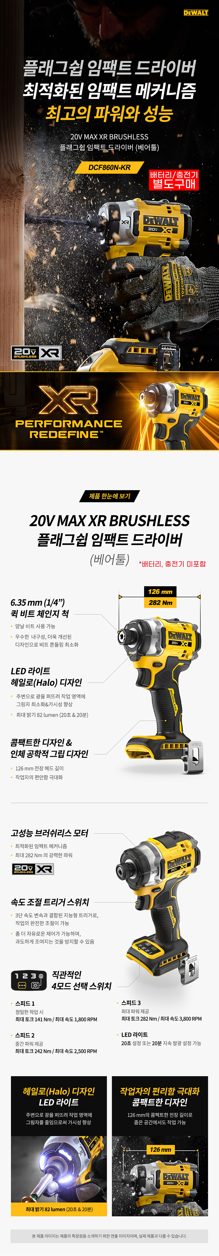 디월트 20V MAX XR BL 충전 플래그쉽 임팩트 드라이버 베어툴 DCF860N