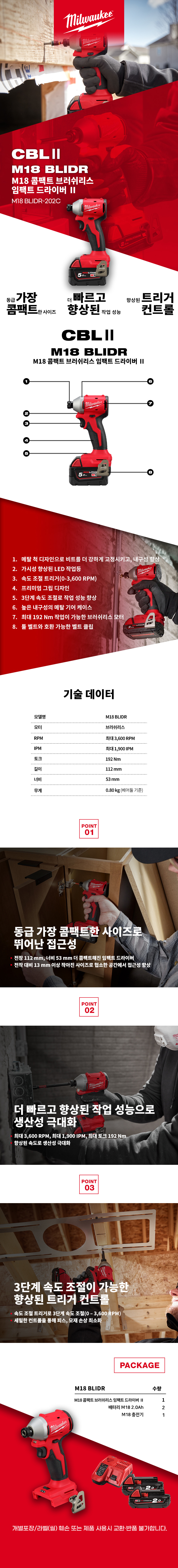 밀워키 18V 2.0Ah 충전 콤팩트 브러쉬리스 임팩트 드라이버II M18 BLIDR-202C 배터리 세트