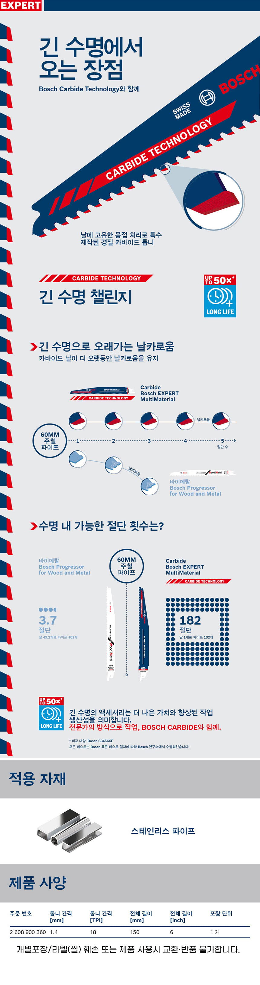 보쉬 EXPERT 컷소날 S 922 EHM 150mm 18TPI 1개입 2608900360 컷쏘날 컷소기 날 톱날 스텐
