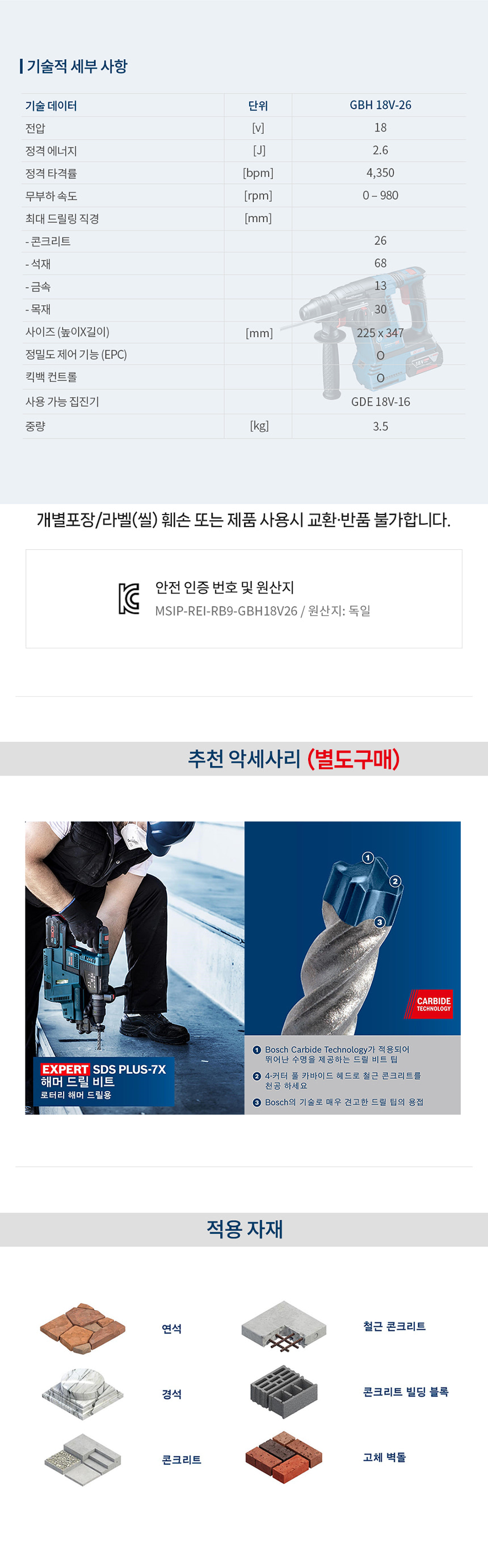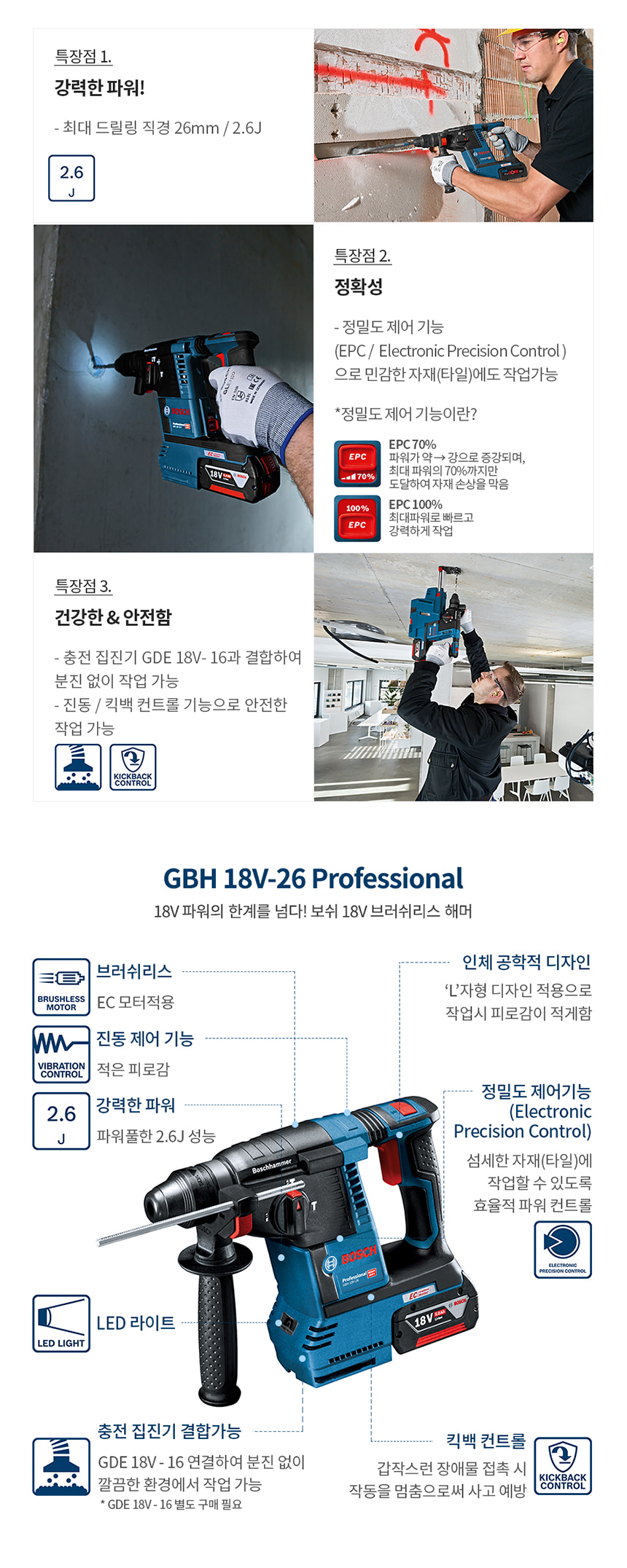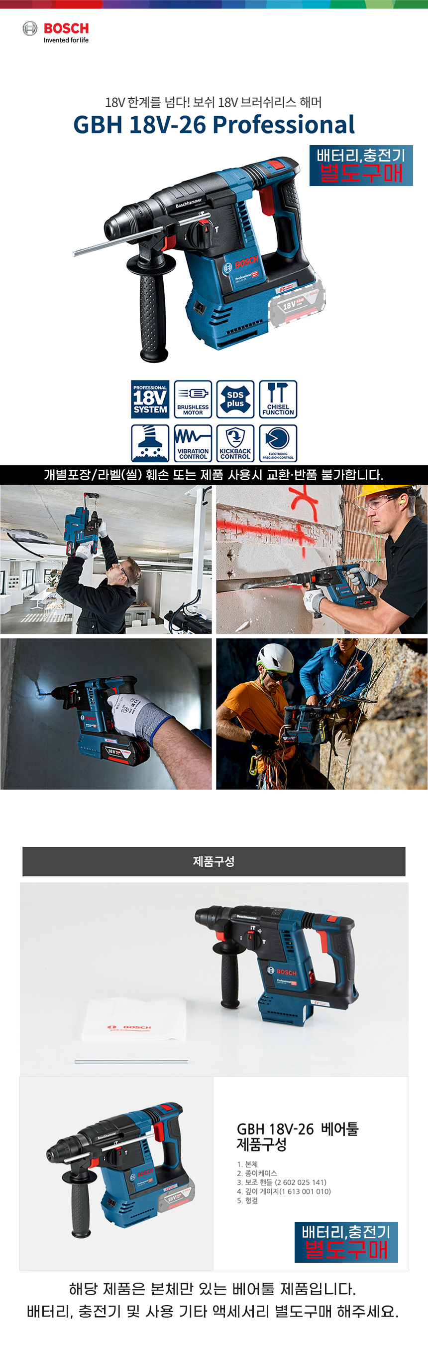 보쉬 GBH 18V-26 충전 브러쉬리스 해머 베어툴 06119090B0