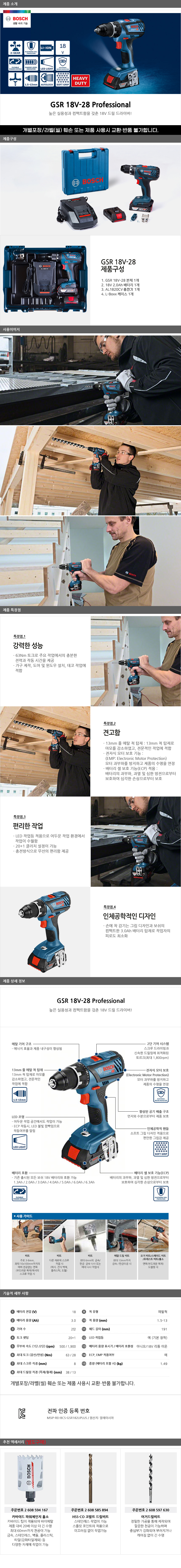 보쉬 GSR 18V-28 충전 컴팩트 드릴 드라이버 2.0Ah 세트 06019H41B2