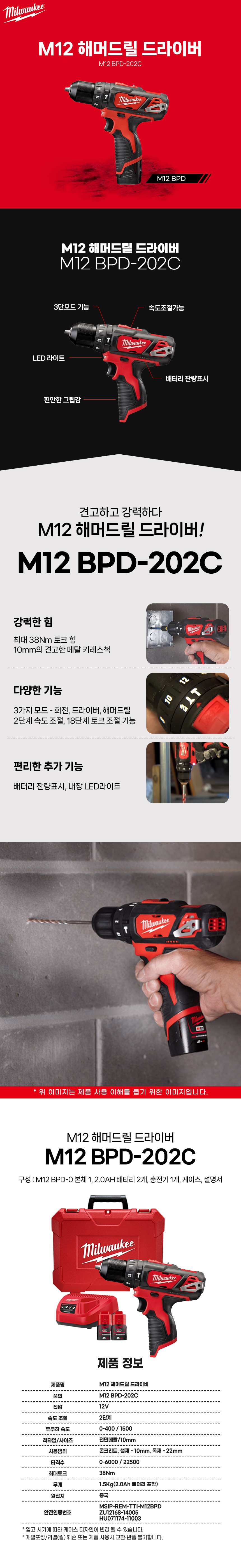 밀워키 12V 2.0ahX2 충전 해머 드릴 드라이버 세트 M12 BPD-202C