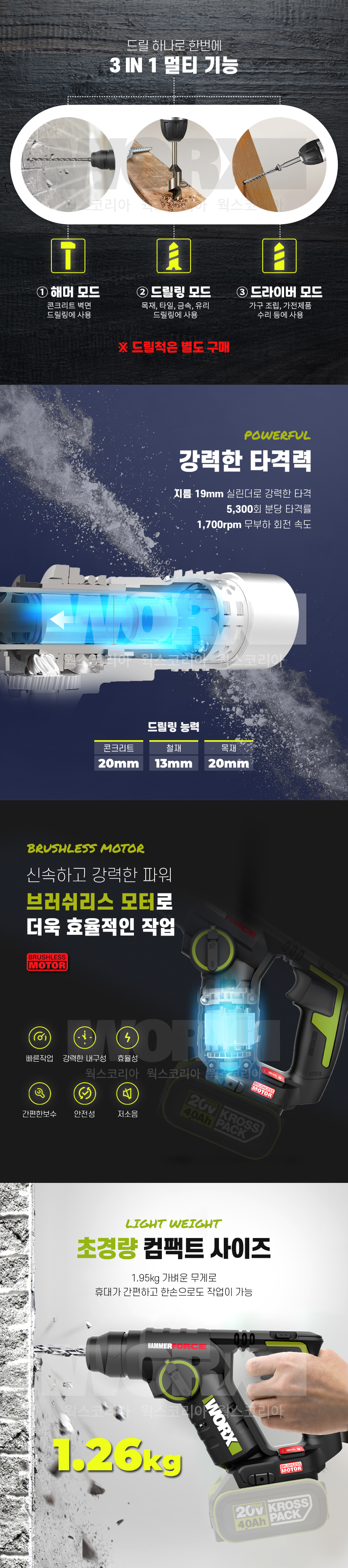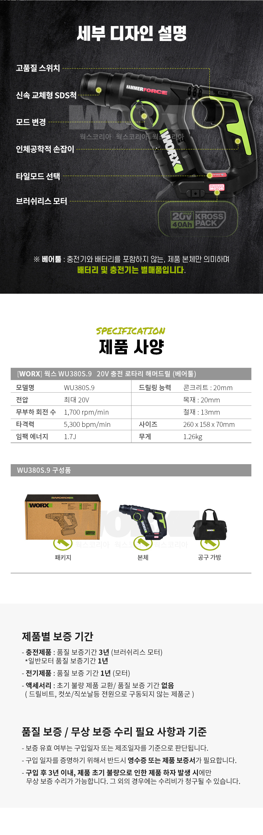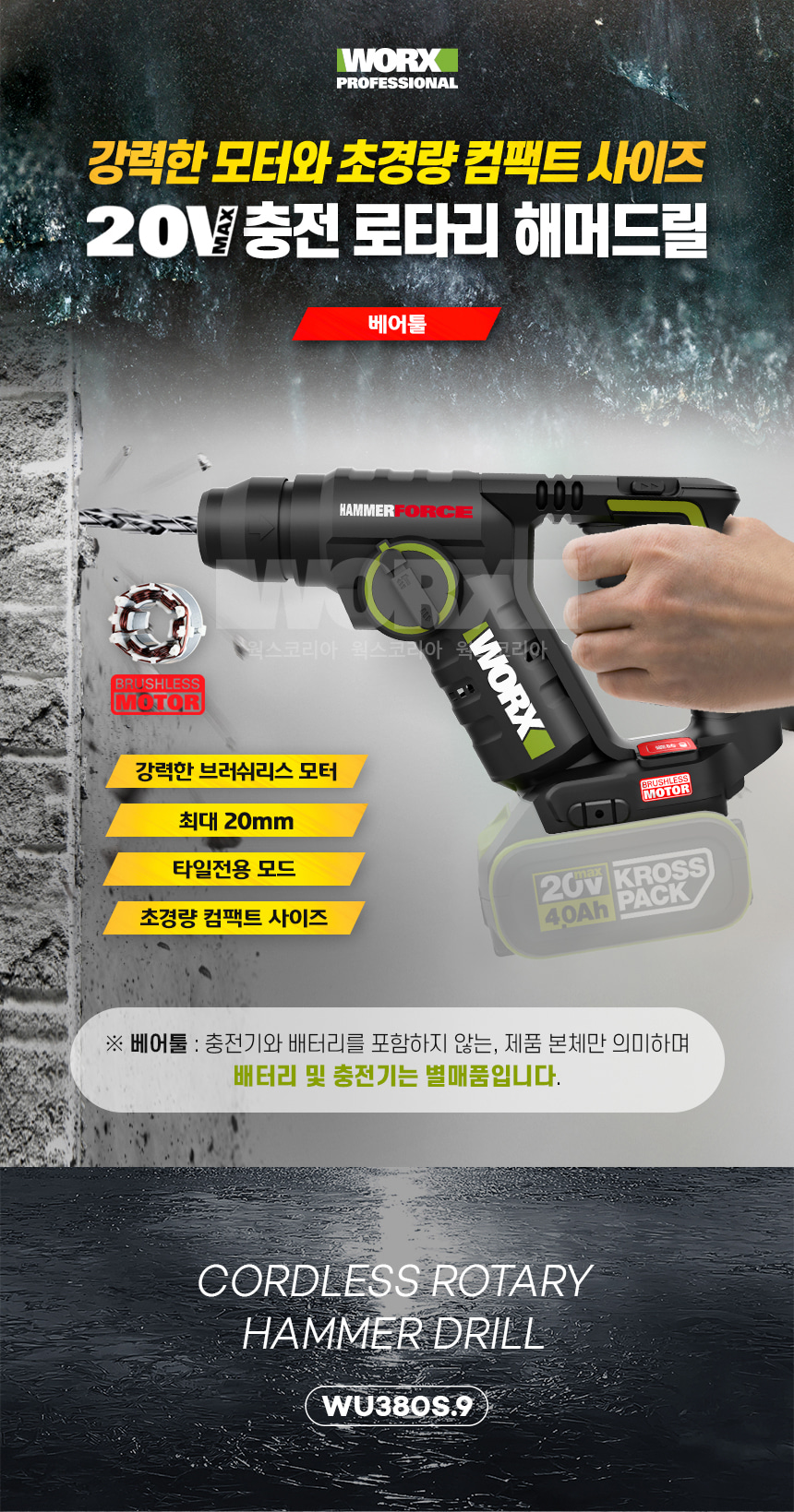 웍스 WU380S.9 충전 20V 전동공구 로타리 해머 함마 드릴 콘크리트 철재 목재 베어툴