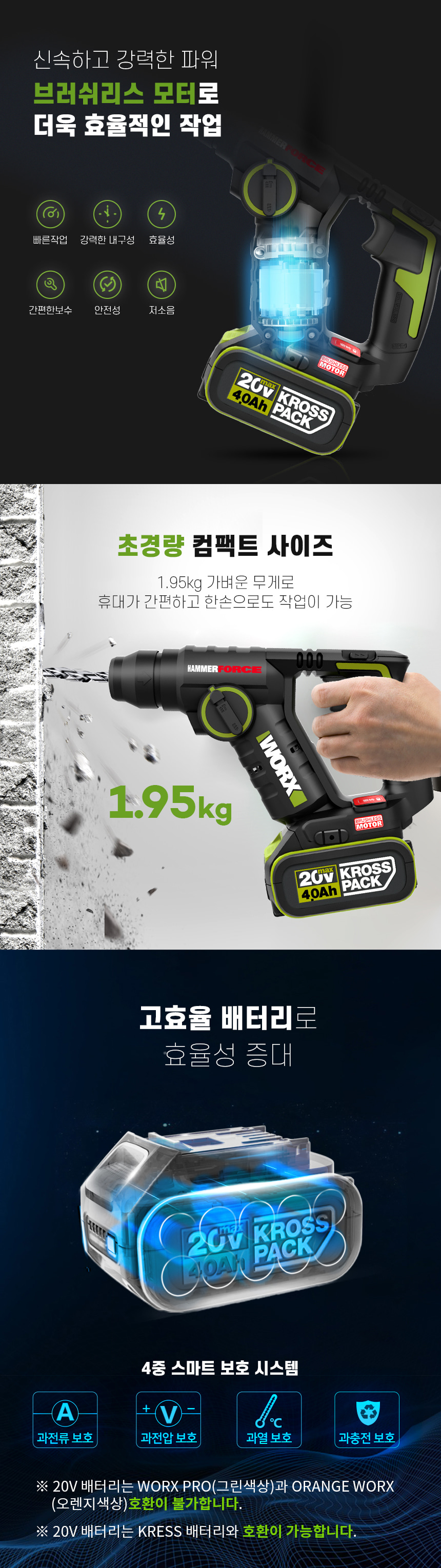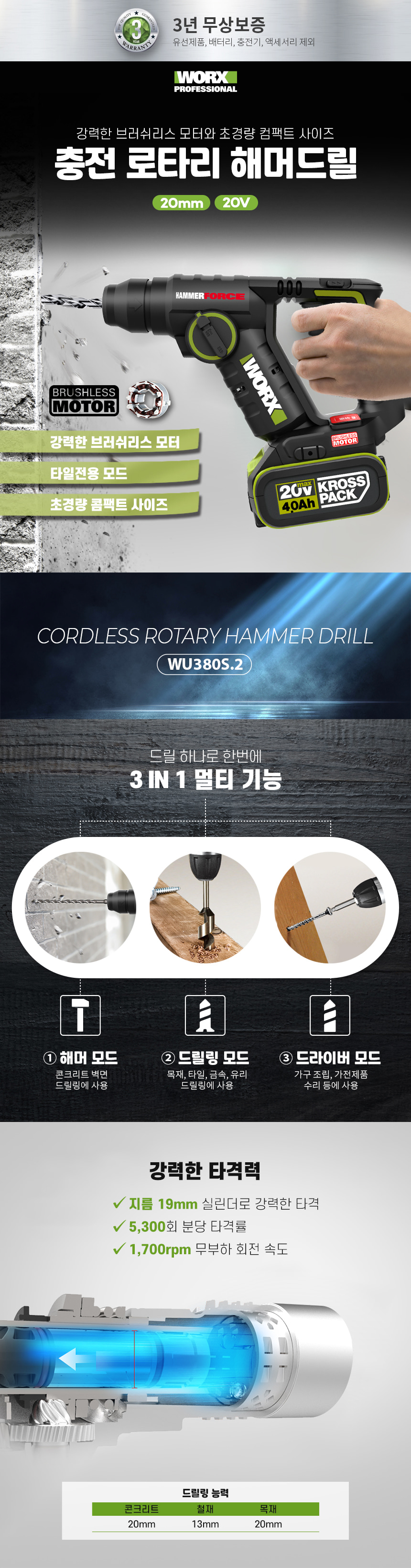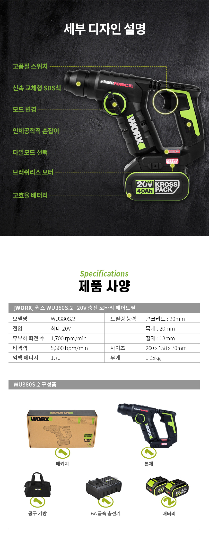 웍스 WU380S.2 충전 20V 전동공구 로타리 해머 함마 드릴 콘크리트 철재 목재
