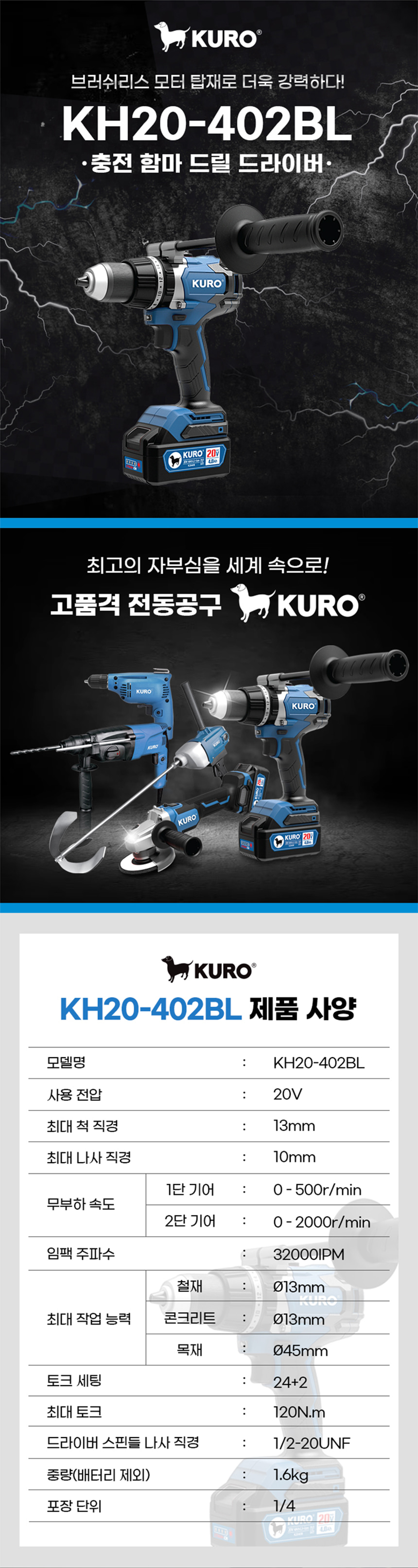 쿠로 20V 4.0Ah 충전 함마 드릴 드라이버 세트 KH20-402BL 드릴링 타공