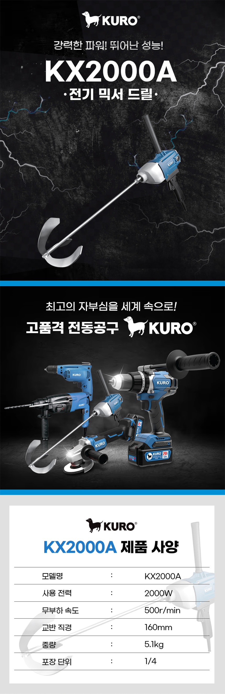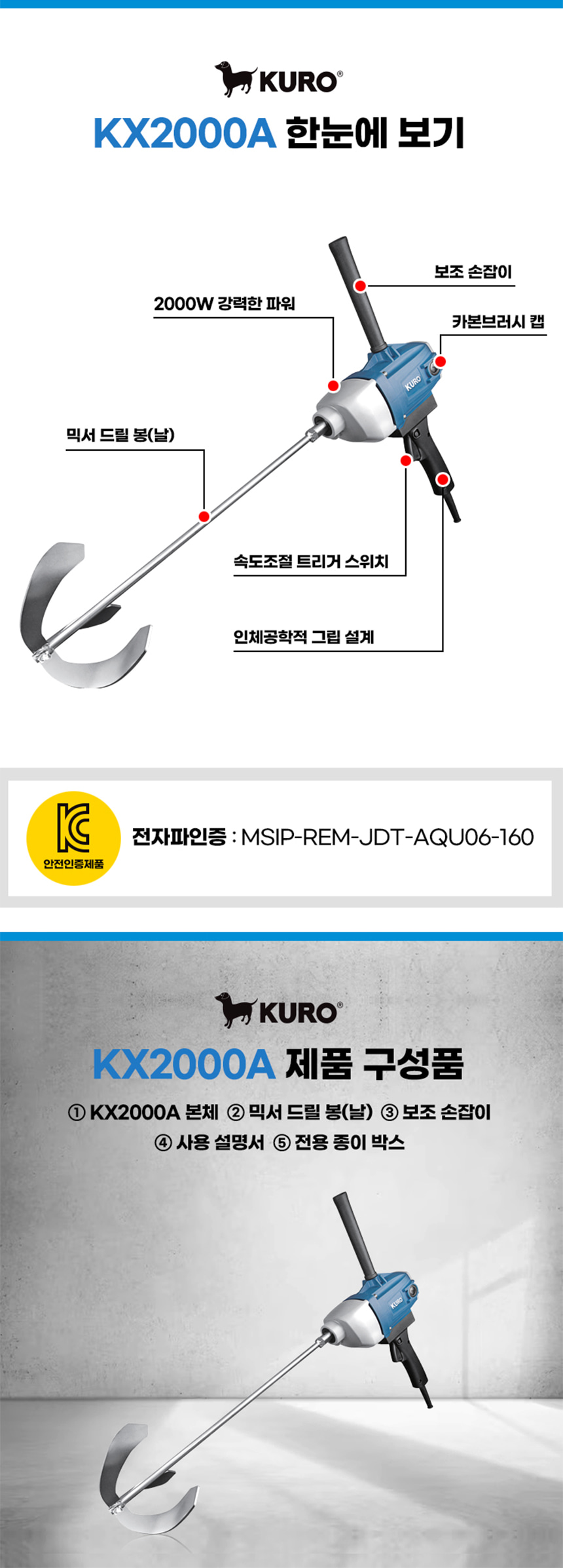 쿠로 2000W 전기 유선 믹서 드릴 KX2000A 날포함 시멘트 페인트 믹싱 혼합