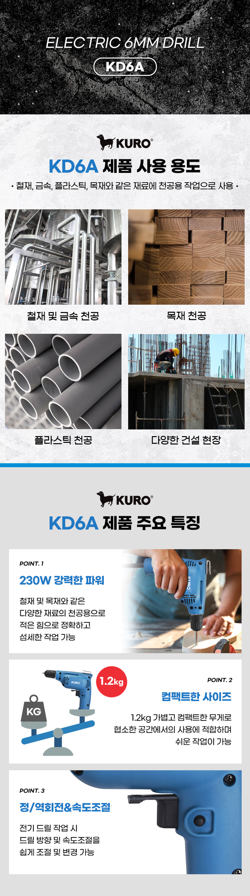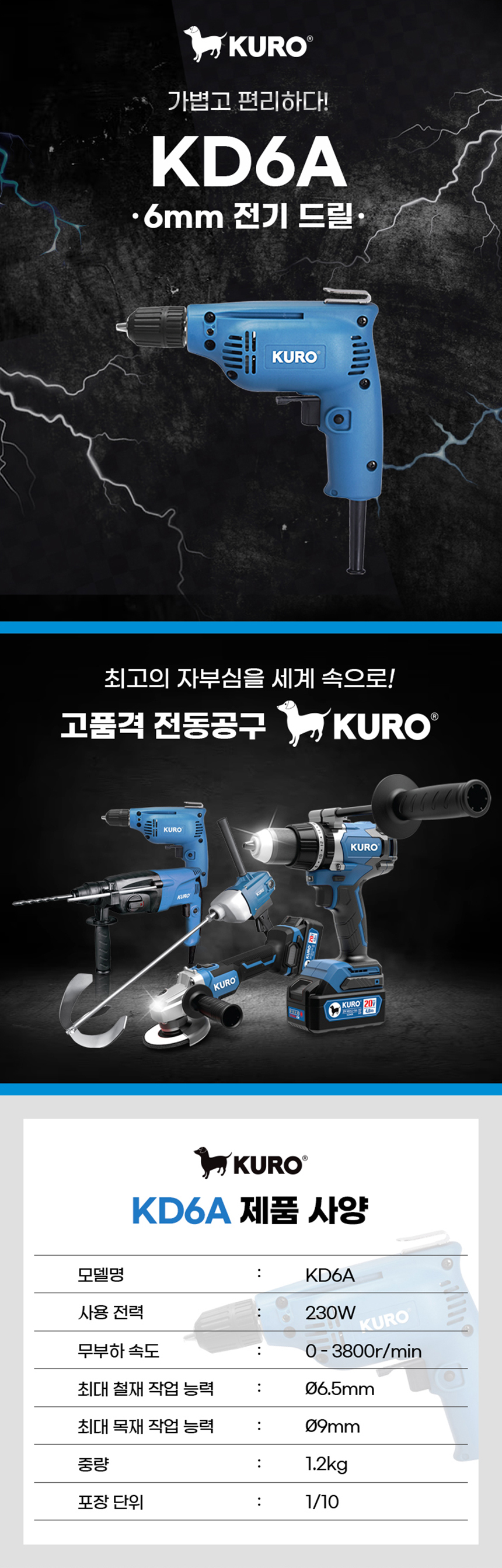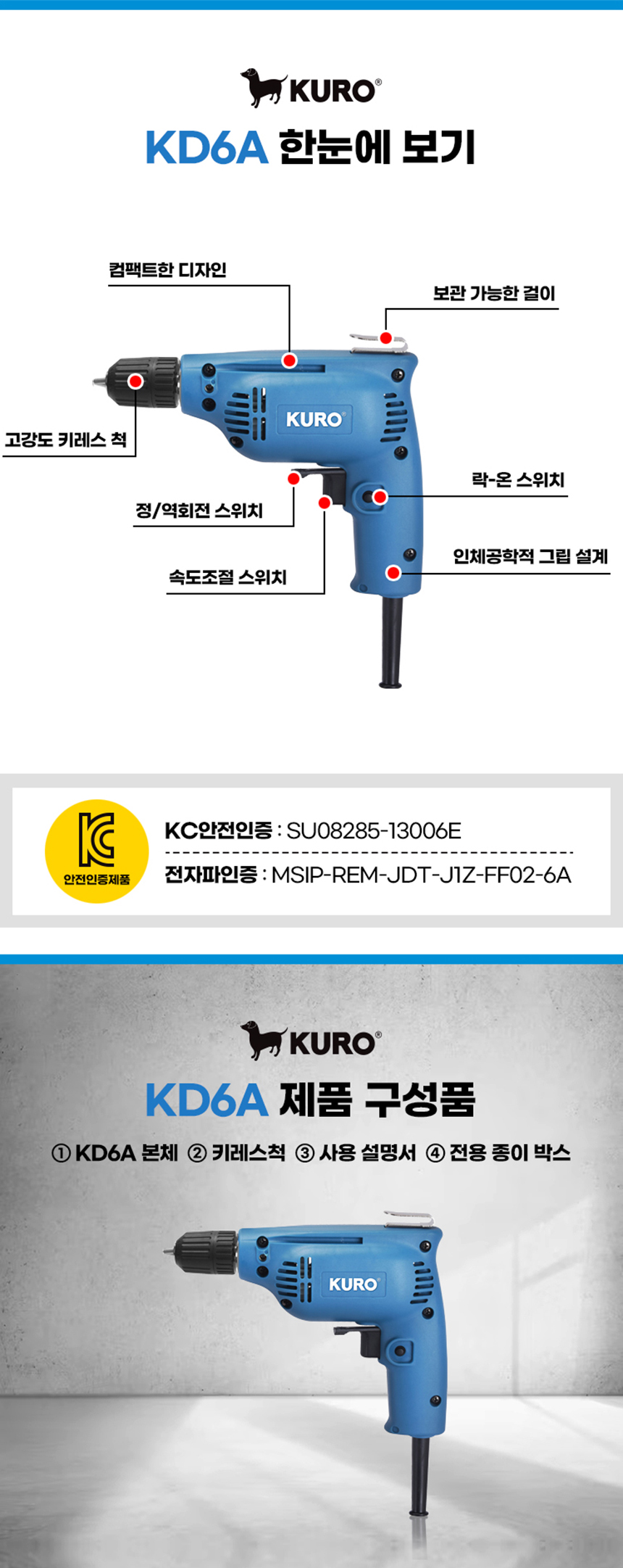 쿠로 전기 드릴 KD6A 유선 6mm 230W 소형 경량